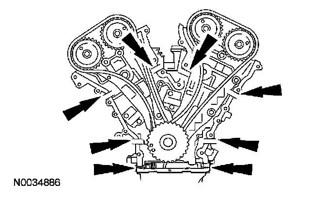 CAUTION: During engine repair procedures, cleanliness is extremely important. Any foreign material, including any material created while cleaning gasket surfaces, that enters the oil passages, coolant passages or the oil pan, can cause engine failure.
