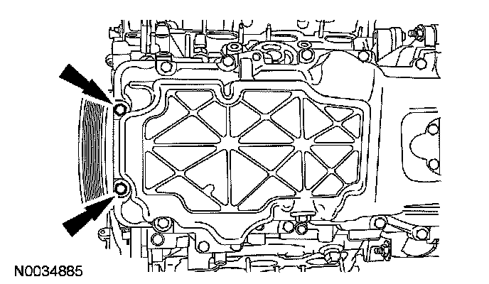 15. Remove the 2 oil pan-to-front cover bolts.