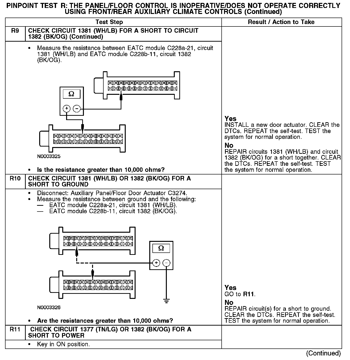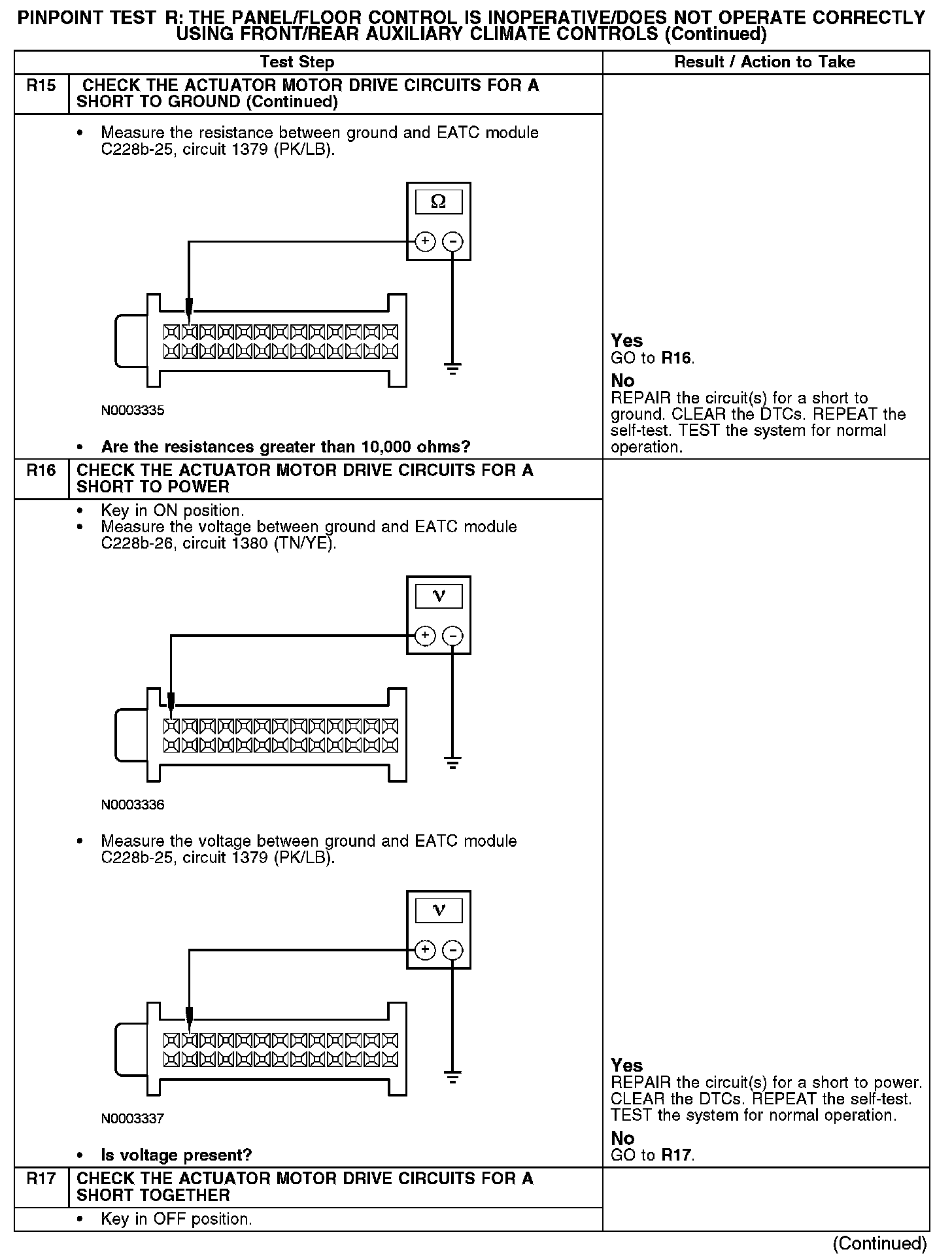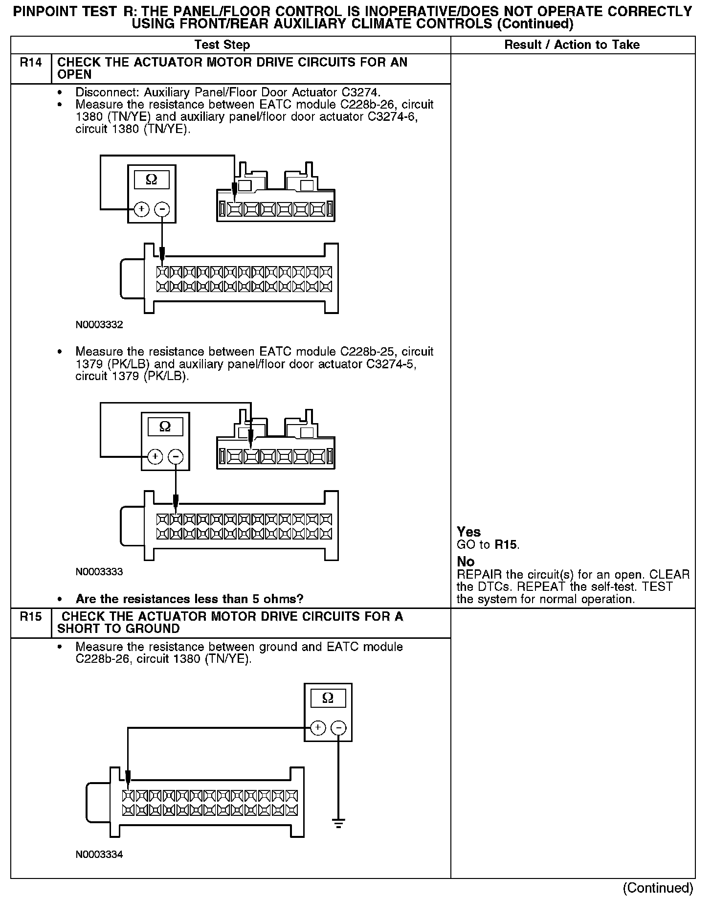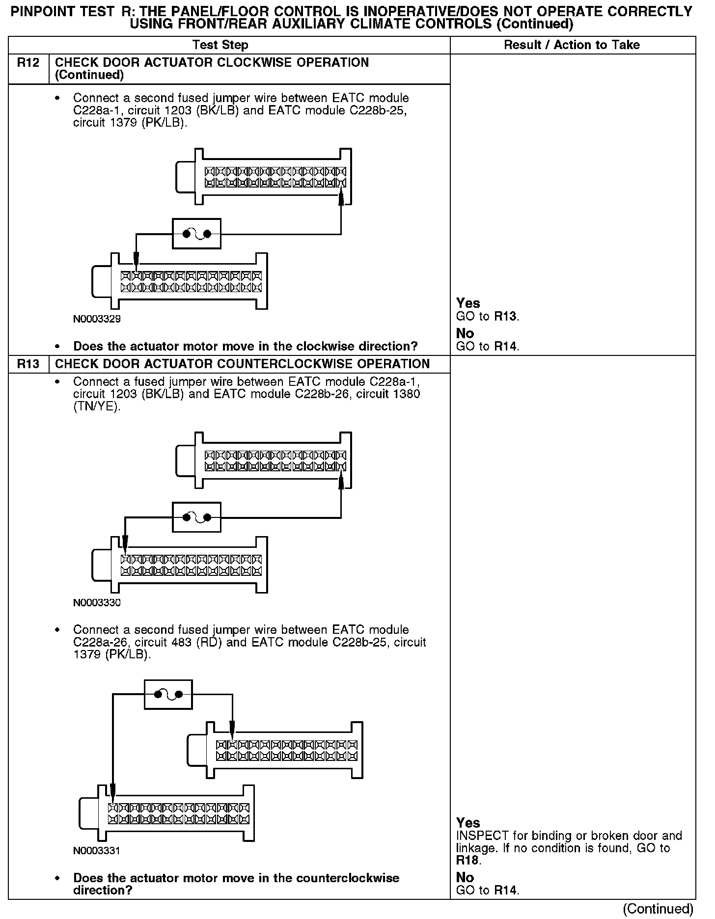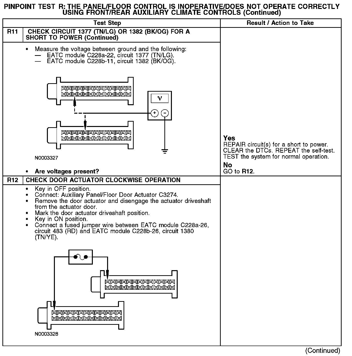Under normal operation, to rotate the mode door actuator clockwise, the EATC module supplies voltage to the auxiliary panel/floor door actuator through the circuit 1380 (TN/YE), and supplies ground through circuit 1379 (PK/LB). To rotate the auxiliary panel/floor door actuator counterclockwise, the EATC module reverses the voltage and ground circuits.