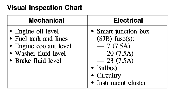 9. If the DTCs retrieved are related to the concern, go to the Instrument Cluster Diagnostic Trouble Code (DTC) Index, the Smart Junction Box (SJB) Diagnostic Trouble Code (DTC) Index, or the Powertrain Control Module (PCM) Diagnostic Trouble Code (DTC) Index. For all other DTCs, refer to Body Control Systems (Multifunction Electronic Control Module). Instrument Cluster DTC Chart Smart Junction Box (SJB) DTC Chart Powertrain Control Module (PCM) Diagnostic Trouble Code (DTC) Index