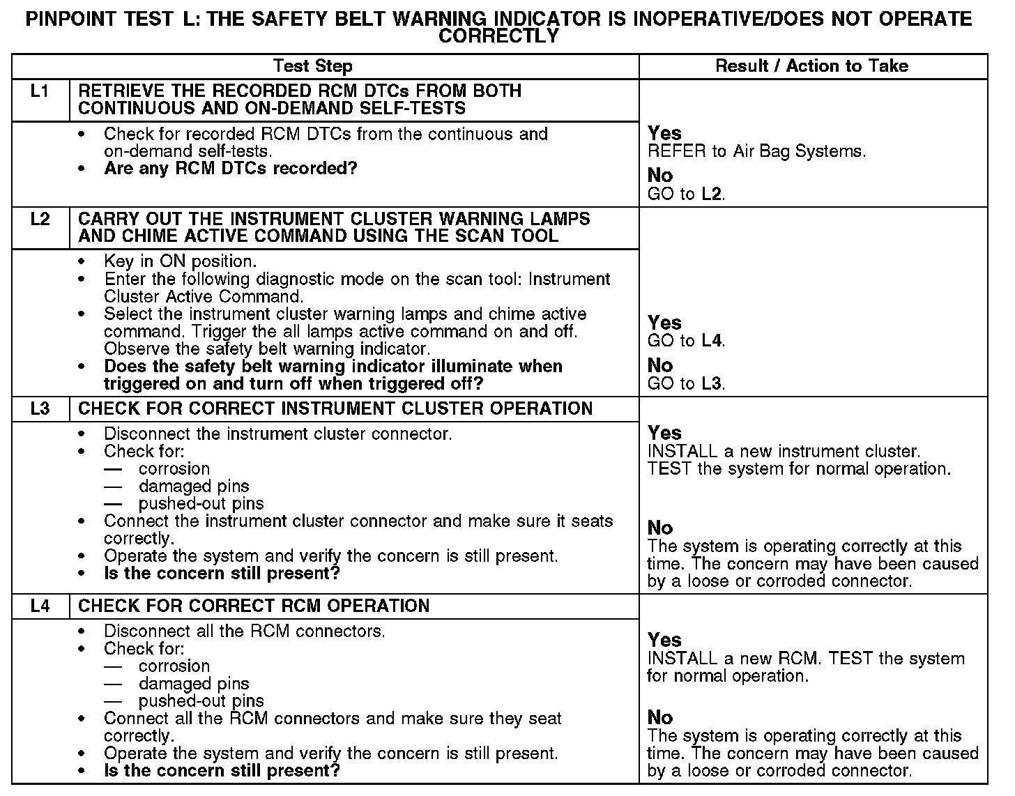 PINPOINT TEST L: THE SAFETY BELT WARNING INDICATOR IS INOPERATIVE/DOES NOT OPERATE CORRECTLYL1-L4: