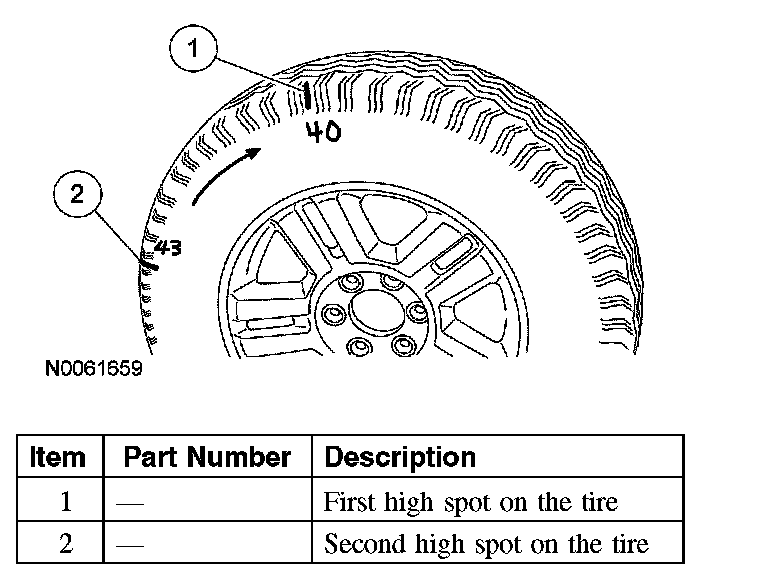 ^ NOTE: To be SURE that the tire is causing the high runout, you must have 2 runout measurements that are not within specification and the high spots must be in approximately the same location on the tire's sidewall. In other words, the high spot followed the tire when it was repositioned 180 degrees on the wheel.