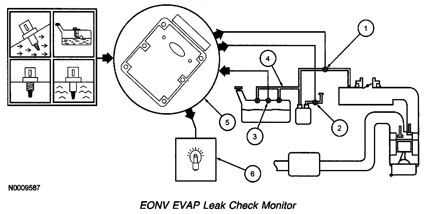 4. The EONV EVAP leak check monitor uses the naturally occurring change in fuel tank pressure as a means to detect a leak in the EVAP system. At key off, a target pressure and vacuum is determined by the PCM. These target values are based on the fuel level and the ambient temperature at key off. As the fuel tank temperature increases, the pressure in the tank increases and as the temperature decreases a vacuum develops. If a leak is present in the EVAP system the fuel tank pressure or vacuum does not exceed the target value during the testing time period. The EONV EVAP leak check monitor begins at key off.