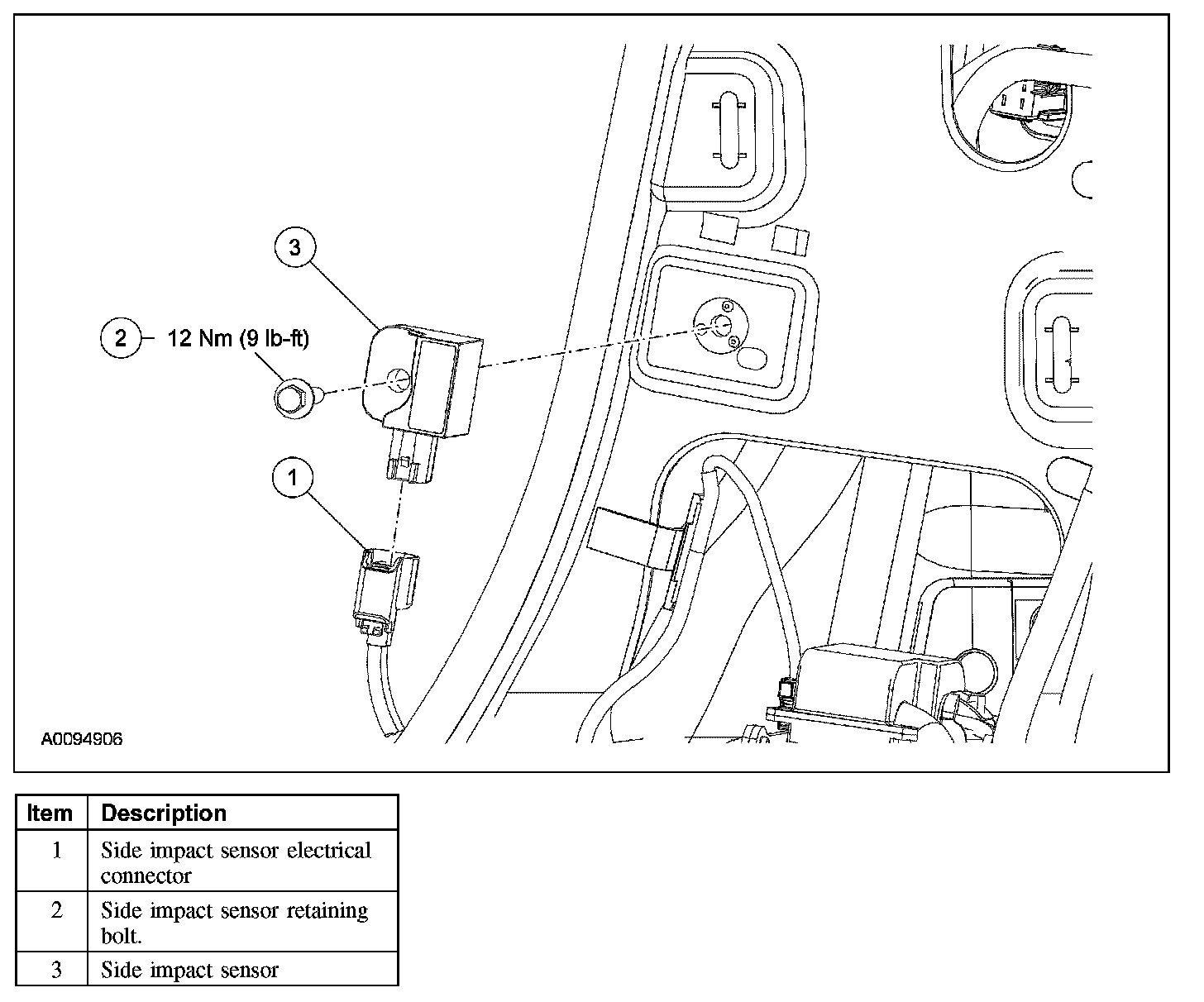4. WARNING: The tightening torque of the air bag side impact sensor retaining bolt is critical for correct system operation.