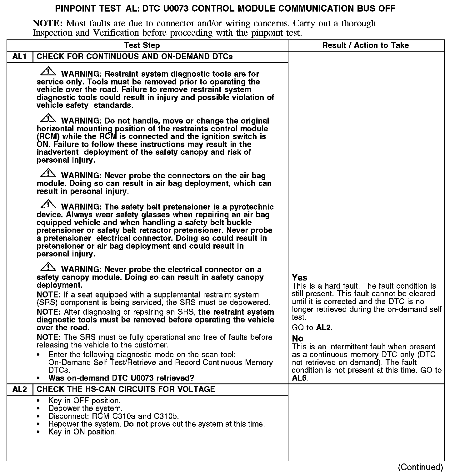PINPOINT TEST AL: DTC U0073 - CONTROL MODULE COMMUNICATION BUS OFFAL1-AL2: