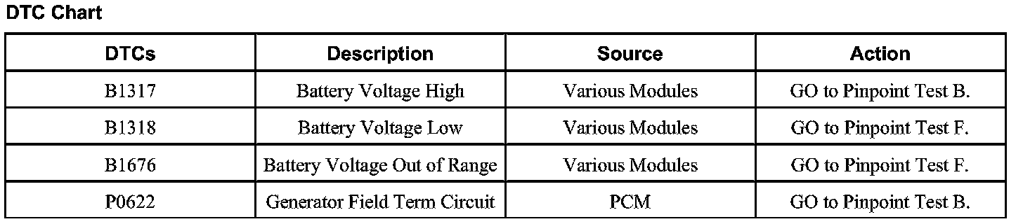 NOTE: DTC P0622 may be set by the loss of the communication lines between the generator and the PCM. The charging system warning indicator then illuminates until the engine is operated at greater than 4,500 rpm (approximately wide open throttle [WOT]) for a minimum of 3 seconds. At this time, the generator self-excites. The charging system warning indicator remains illuminated and the generator operates in a default mode (approximately 13.5 volts) until the engine is turned off.