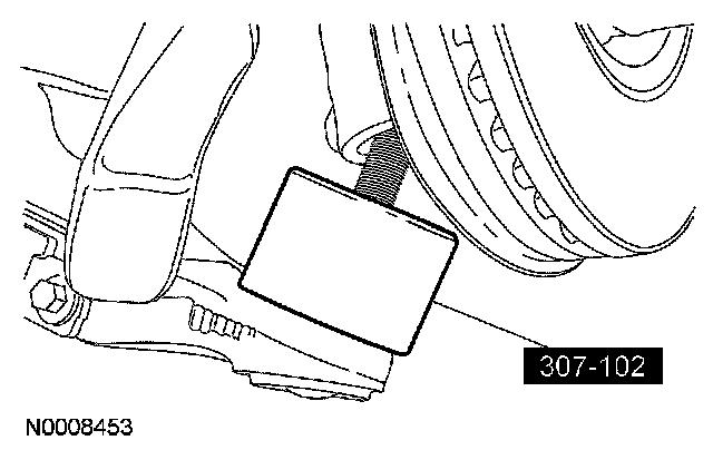 8. After separating the lower arm ball joint from the wheel knuckle, immediately install the special tool over the ball stud before releasing the lower arm and knuckle into the rest position.