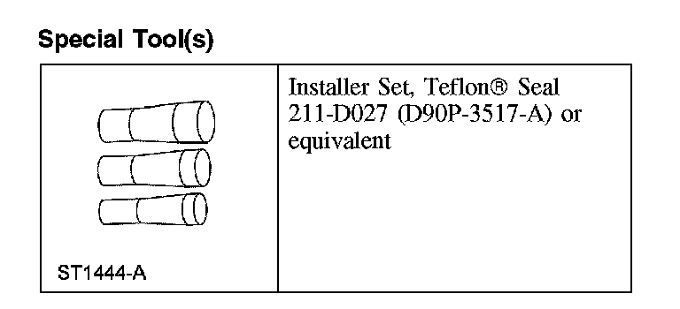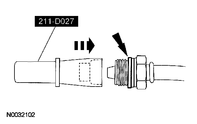 ^ Using the special tool, install a new Teflon O-ring seal on the power steering pressure line fitting and the power steering pressure line fitting-to-pump adapter.