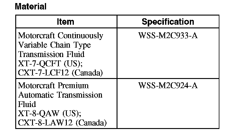 CAUTION: MERCON (R), MERCON (R) V, MERCON (R) SP, Motorcraft Premium Automatic Transmission Fluid and Motorcraft Continuously Variable Chain Type Transmission Fluid are not interchangeable transmission fluids. The use of any fluid other than what is recommended for this transmission will cause transmission damage.