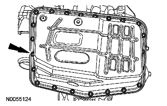 5. Remove the transmission fluid pan bolts and the transmission fluid pan.