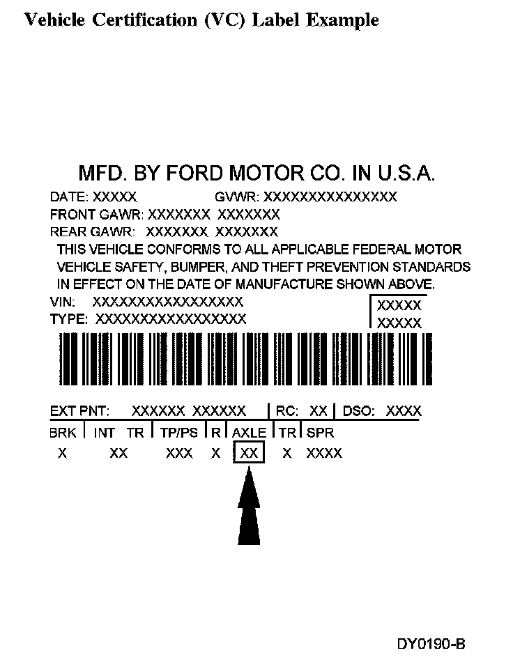 The vehicle certification (VC) label is located in the driver door jamb. The axle code is on the VC label.