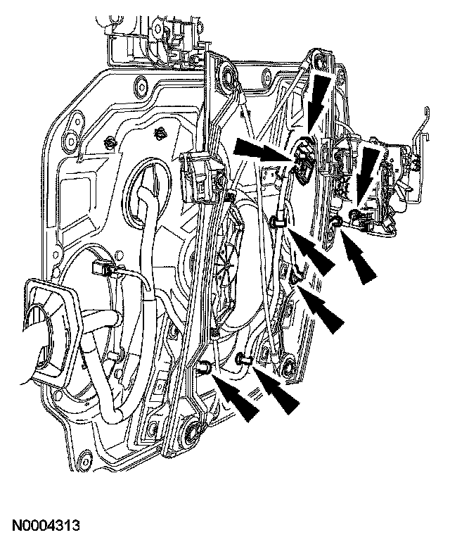 15. Disconnect the 6 wiring harness retainers and the 2 connector retainers from the inside of the door module, then feed the wiring harness through the door module.