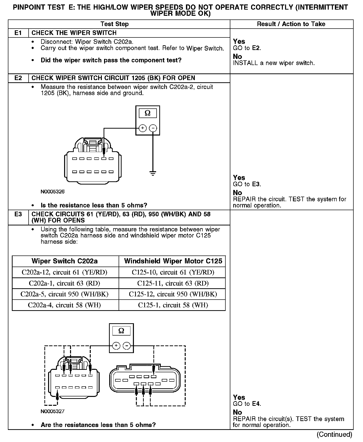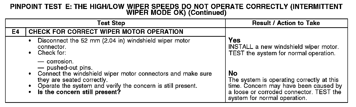PINPOINT TEST E: THE HIGH/LOW WIPER SPEEDS DO NOT OPERATE CORRECTLY (INTERMITTENT WIPER MODE OK)E1-E3: