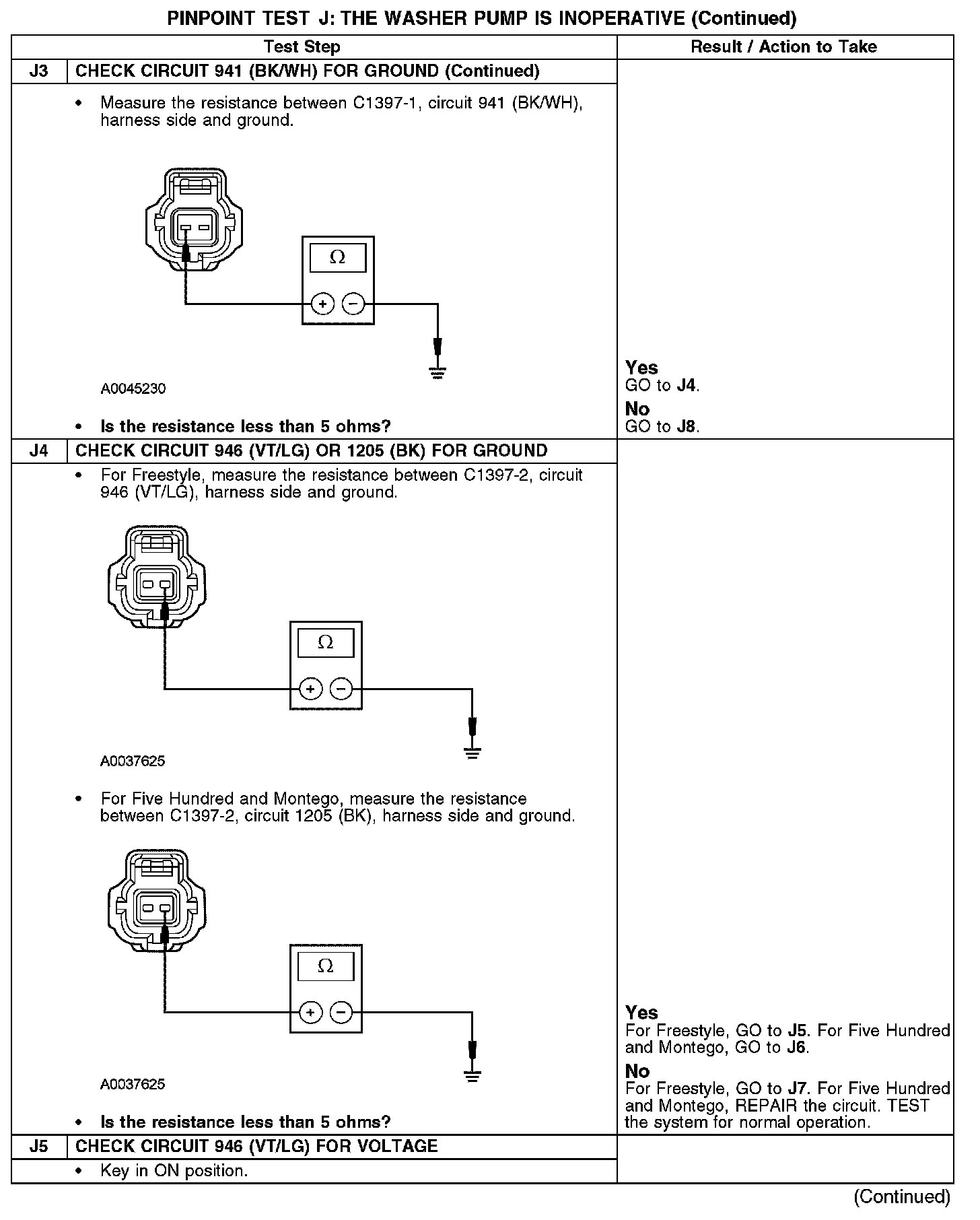 On Freestyle vehicles, the washer pump motor is grounded to the chassis by internal relays in the windshield and rear window wiper motors through circuit 946 (VT/LG) when the windshield washer is activated, or through circuit 941 (BK/WH) when the rear window washer is activated. On Five Hundred and Montego vehicles, the washer pump motor is grounded to the chassis through circuit 1205 (BK). When the wiper switch is pressed to the windshield wash position, a ground signal is provided to the windshield wiper motor and module assembly on circuit 28 (BK/PK) and the internal module activates the internal washer relay, which provides power to the washer pump motor through circuit 941 (BK/WH). On Freestyle vehicles, when the rear washer is activated, the internal relay in the rear wiper motor provides power to the washer pump through circuit 946 (VT/LG).