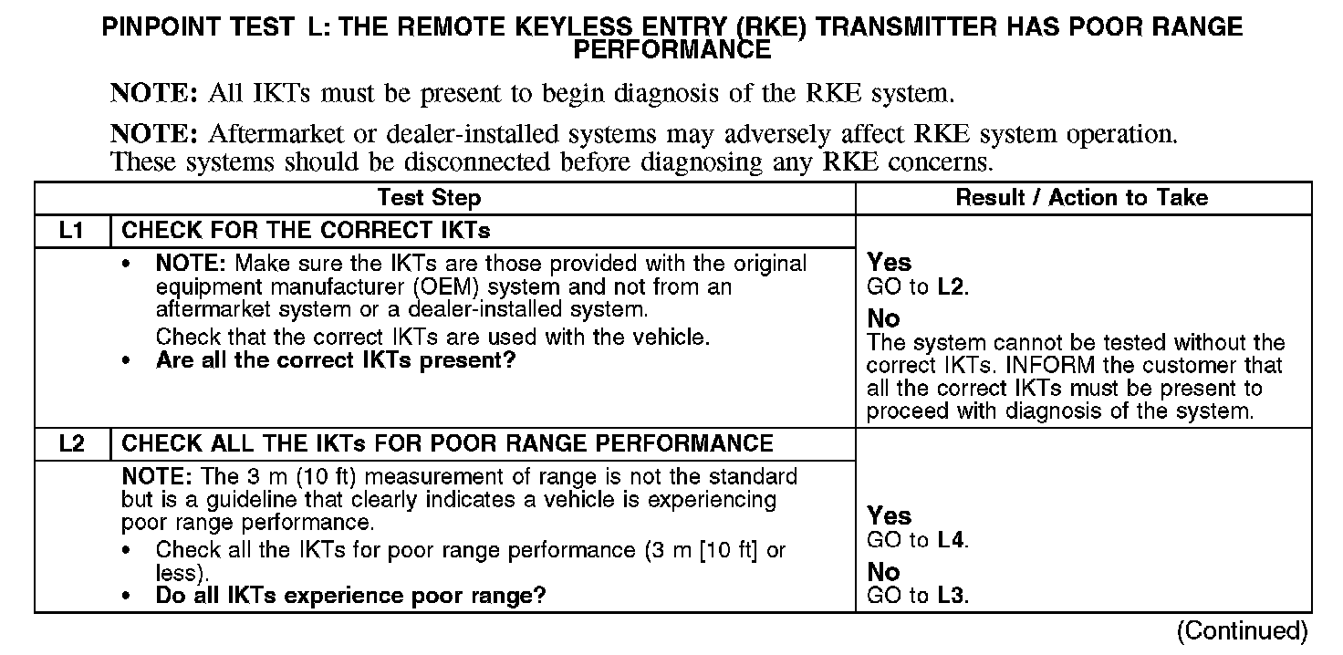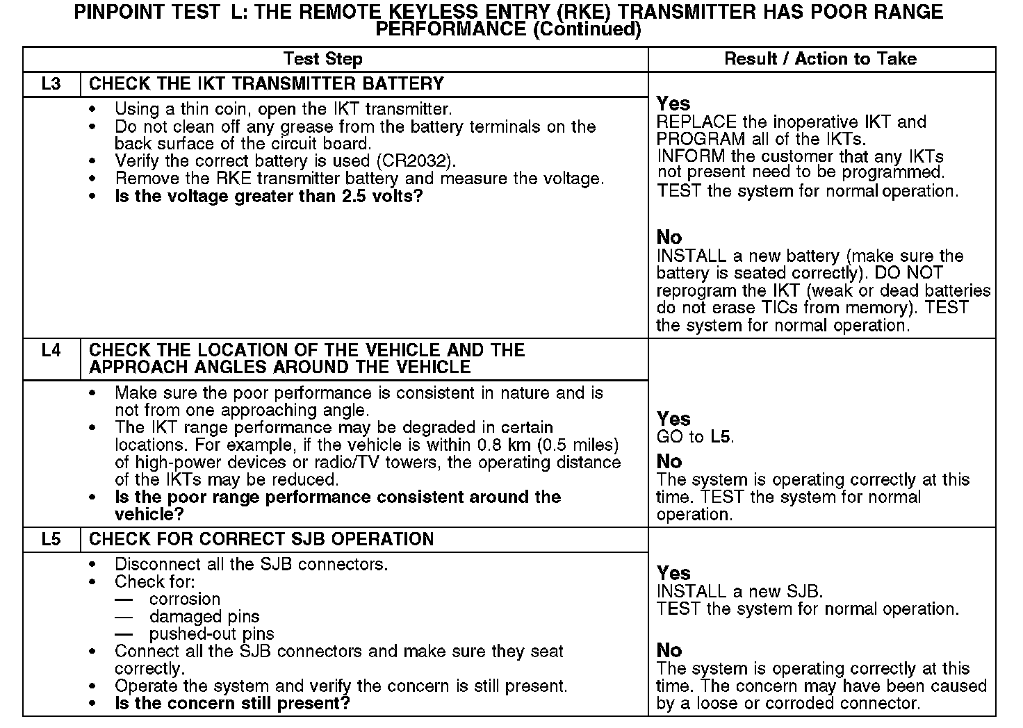 PINPOINT TEST L: THE REMOTE KEYLESS ENTRY (RKE) TRANSMITTER HAS POOR RANGE PERFORMANCE