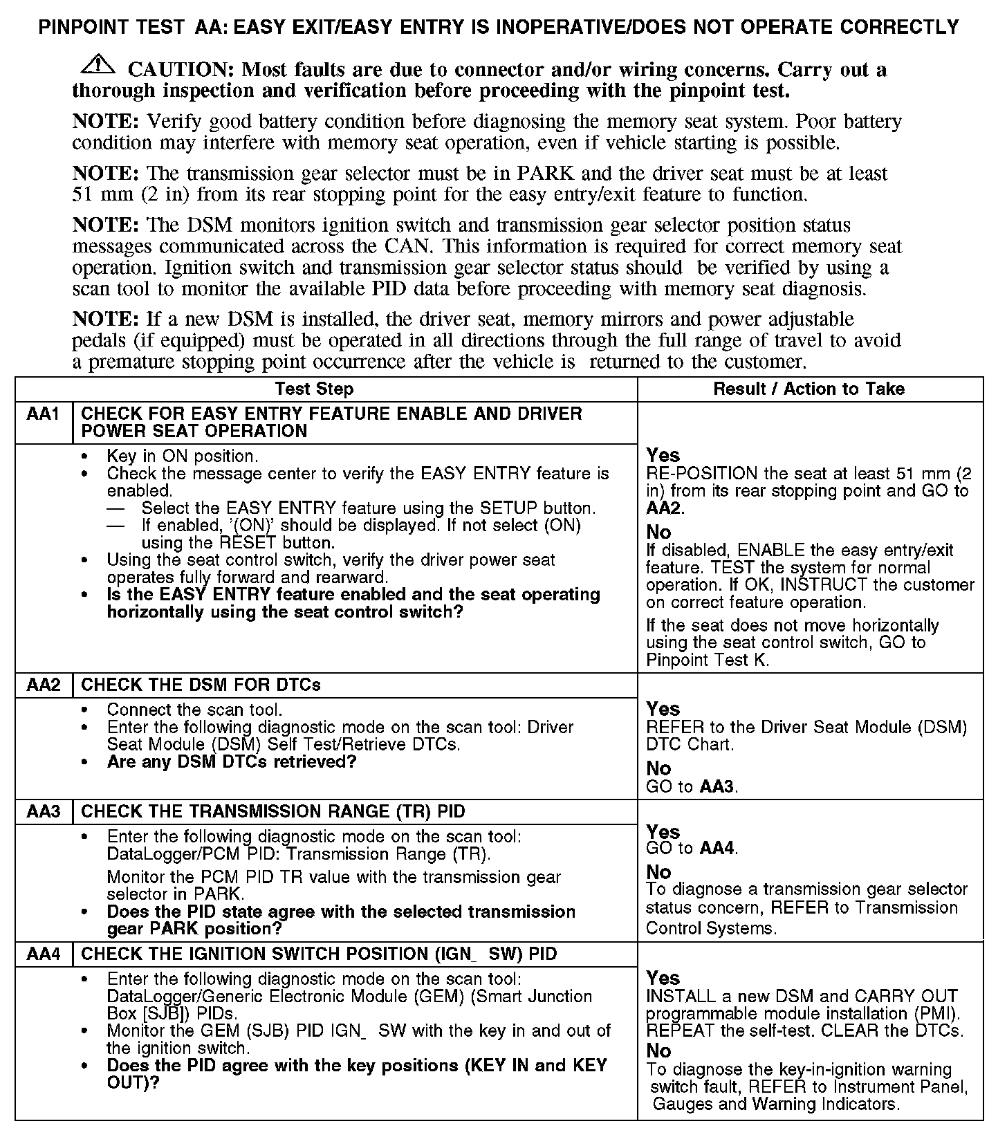 PINPOINT TEST AA: EASY EXIT/EASY ENTRY IS INOPERATIVE/DOES NOT OPERATE CORRECTLYNormal Operation