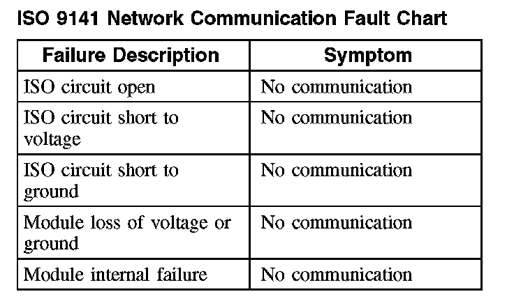The following fault chart describes the specific ISO 9141 network failures and their resulting symptom: