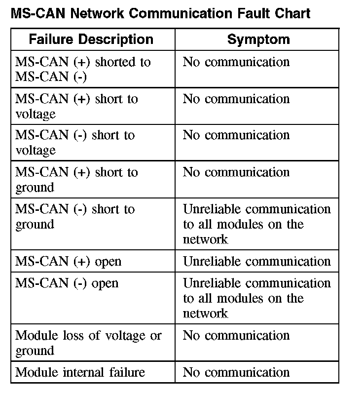 The following fault chart describes the specific MS-CAN network failures and their resulting symptom: