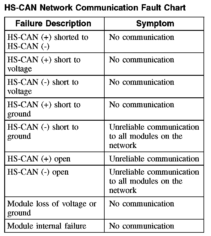 The following fault chart describes the specific HS-CAN network failures and their resulting symptom:
