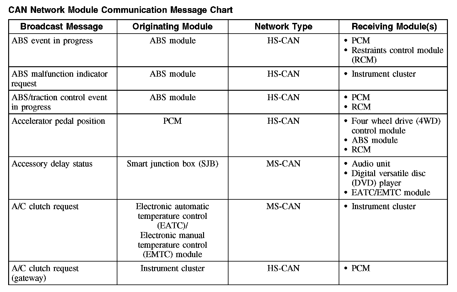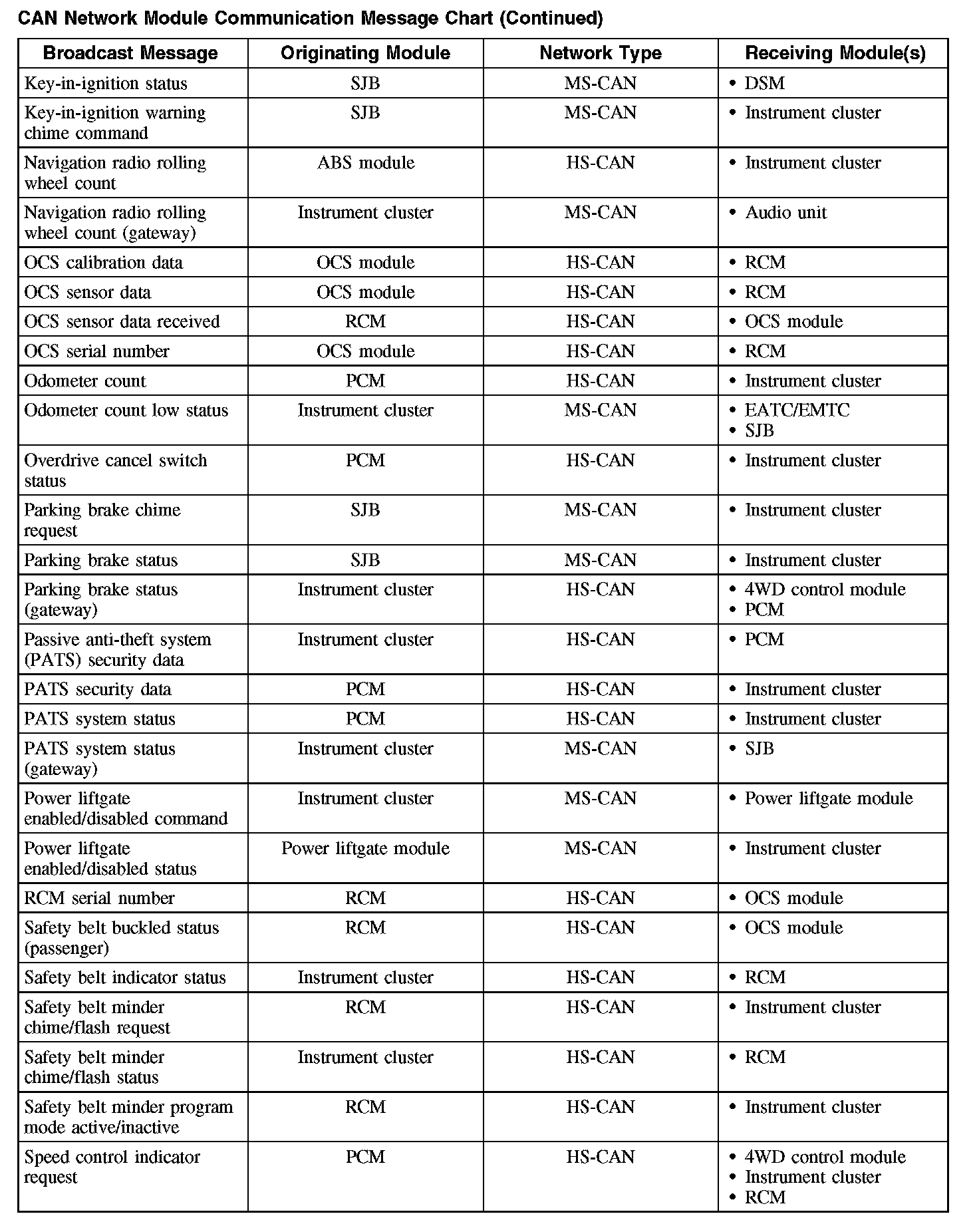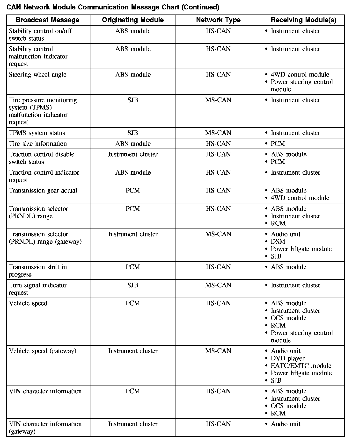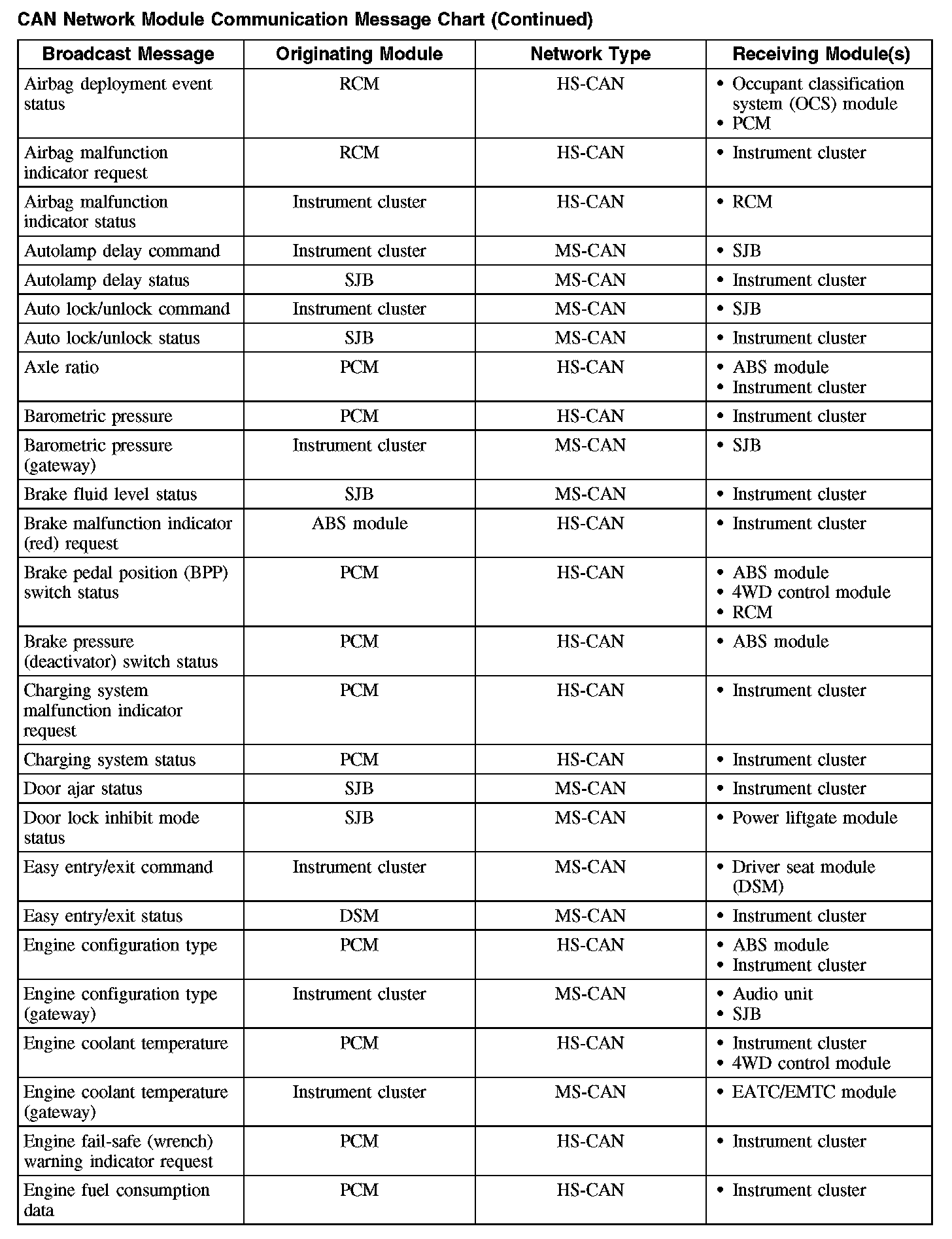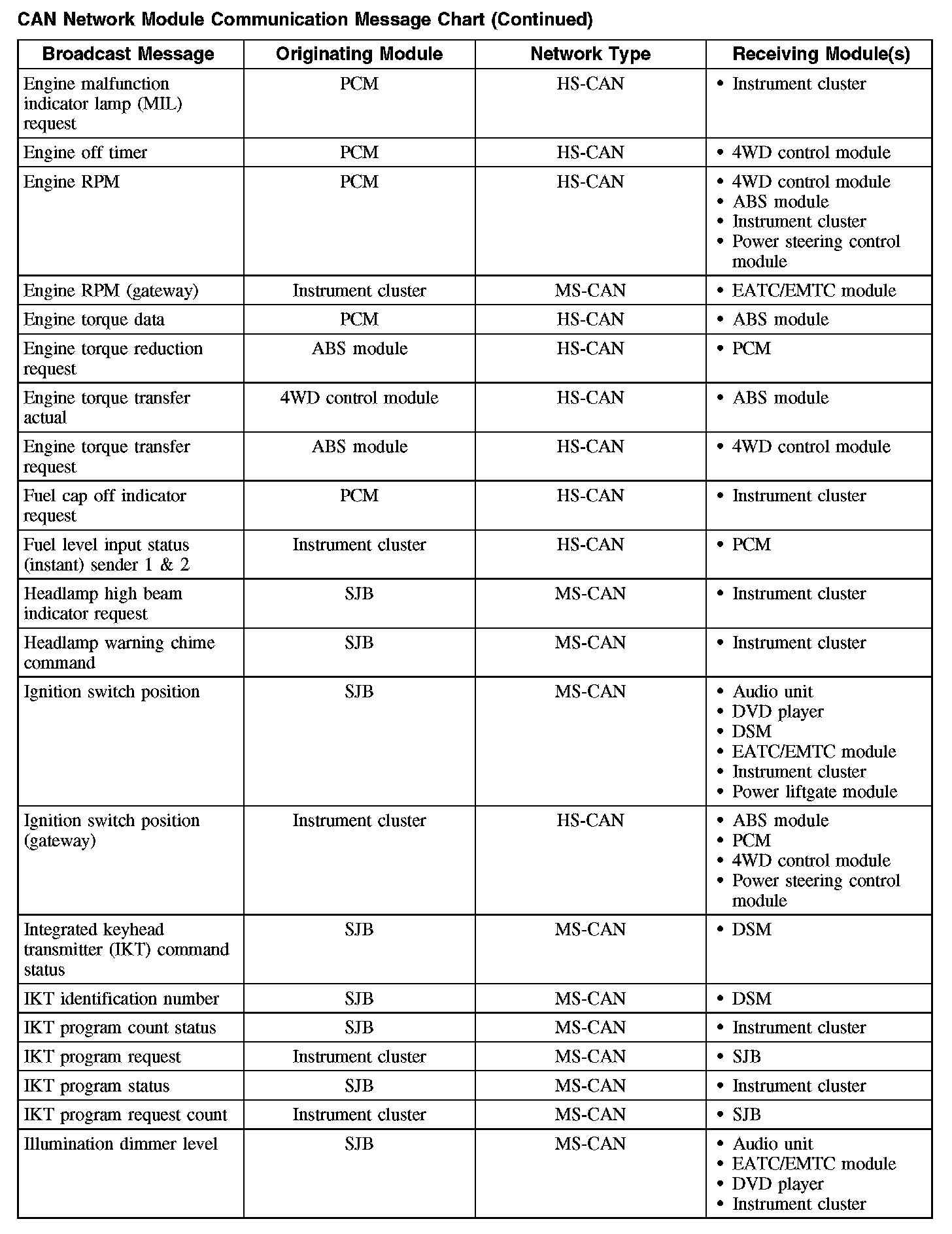 The following chart describes the specific CAN network messages broadcast by each module, and the module(s) that receive the message: