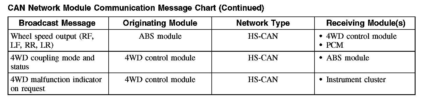 The HS-CAN network uses an unshielded twisted pair cable of data (+) and data (-) circuits. The data (+) and the data (-) circuits are each regulated to approximately 2.5 volts during neutral or rested network traffic. As bus messages are sent on the data (+) circuit, voltage is increased by approximately 1.0 volt. Inversely, the data (-) circuit is reduced by approximately 1.0 volt when a bus message is sent. Multiple bus messages can be sent over the network CAN circuits allowing multiple modules to communicate with each other. The HS-CAN is a high speed communication network used for the instrument cluster, the PCM, the Power steering control module, the four wheel drive (4WD) control module, the restraints control module (RCM) the occupant classification sensor (OCS) module, and the ABS module communications, and designed for real time information transfer and control. The HS-CAN network will not communicate while certain faults are present, but will operate with diminished performance with other faults present. The HS-CAN bus may remain operational when 1 of the 2 termination resistors are not present.
