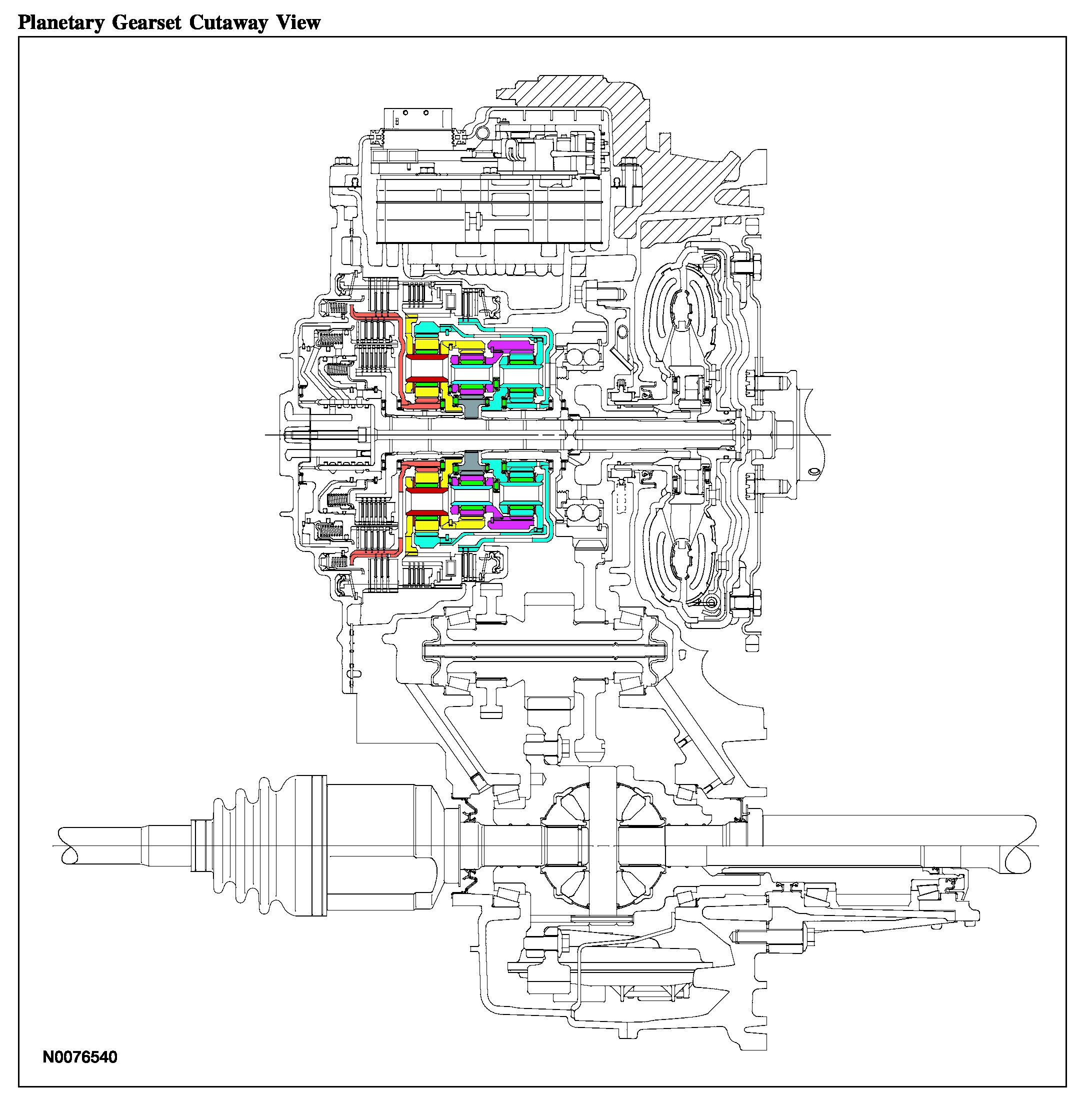 The center planetary ring gear is splined to the rear planetary carrier and transfers power from the center planetary gearset to the rear planetary gearset in 3rd gear, from the rear planetary gearset to the center planetary gearset in 4th gear and is held stationary by the low One-Way Clutch (OWC) and low/reverse clutch in 1st gear and reverse.
