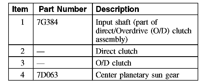 The input shaft is part of the direct/O/D clutch assembly and is splined to the torque converter turbine and the center planetary sun gear. The input shaft transfers power from the torque converter to the rear planetary gearset through the direct (3, 5, R) and O/D (4, 5, 6) clutches and the center planetary sun gear.