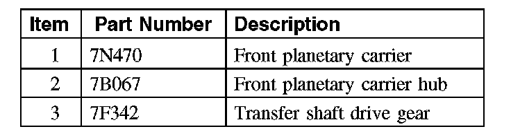 The front planetary carrier is splined to the rear planetary ring gear and transfers power from the rear planetary gearset to the front planetary gearset in 2nd, 3rd, 5th and 6th gear and reverse. The front planetary carrier is splined to the transfer shaft drive gear. The front planetary carrier is the output component for the planetary gearset.