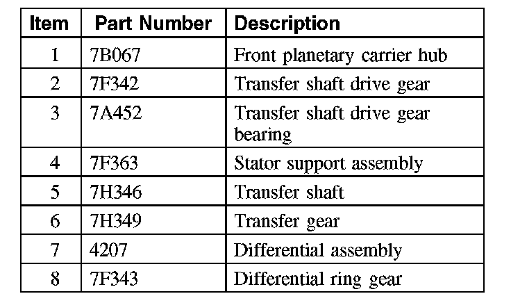 The planetary gear set transfers power to the transfer shaft drive gear through the front planetary carrier hub. The transfer shaft drive gear is part of the stator support assembly. The transfer shaft drive gear turns the transfer shaft and gear assembly which multiplies torque through gear reduction and turns the differential ring gear.