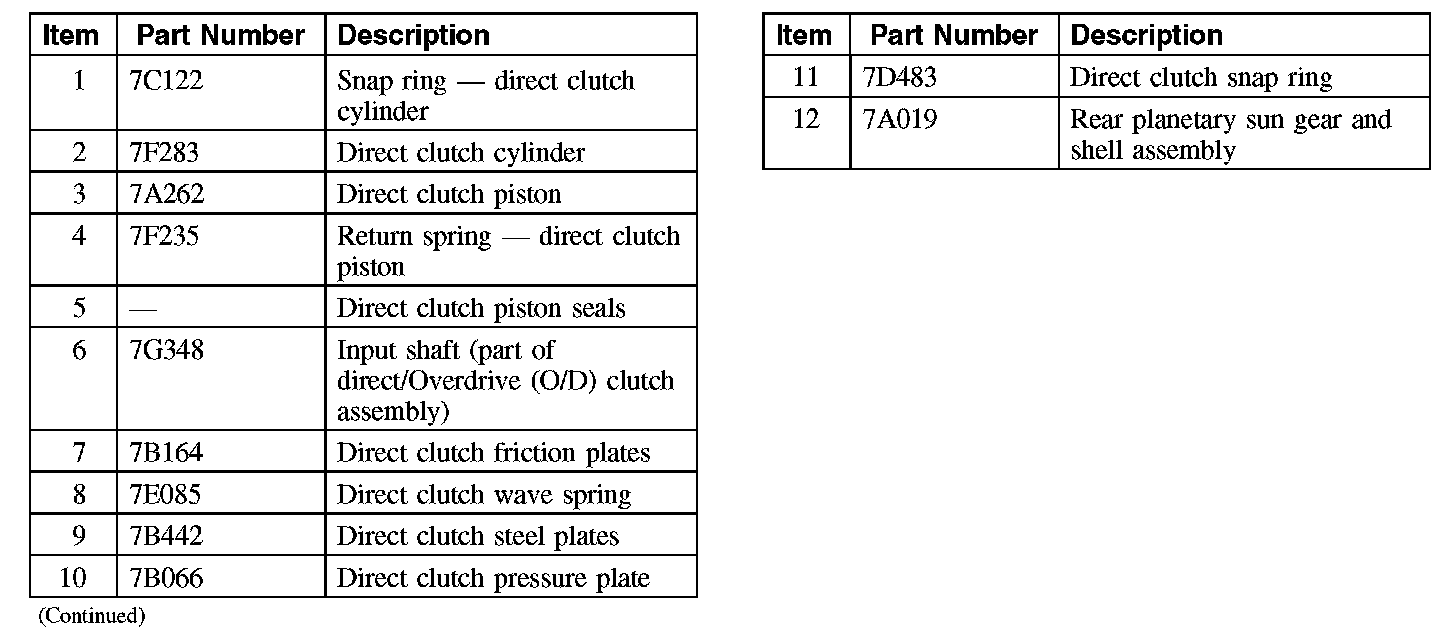 The direct clutch is a drive clutch that transfers power from the direct/O/D hub and shaft assembly to the rear sun gear. The direct clutch is applied in 3rd and 5th gear and reverse.