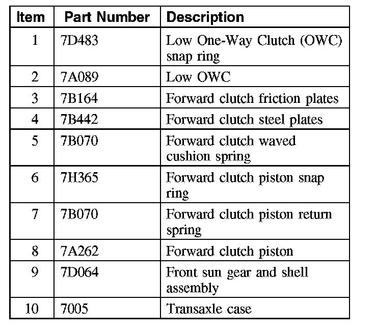 The forward clutch is a brake clutch that holds the front sun gear and shell assembly. The forward clutch is applied in 1st, 2nd, 3rd and 4th gear.