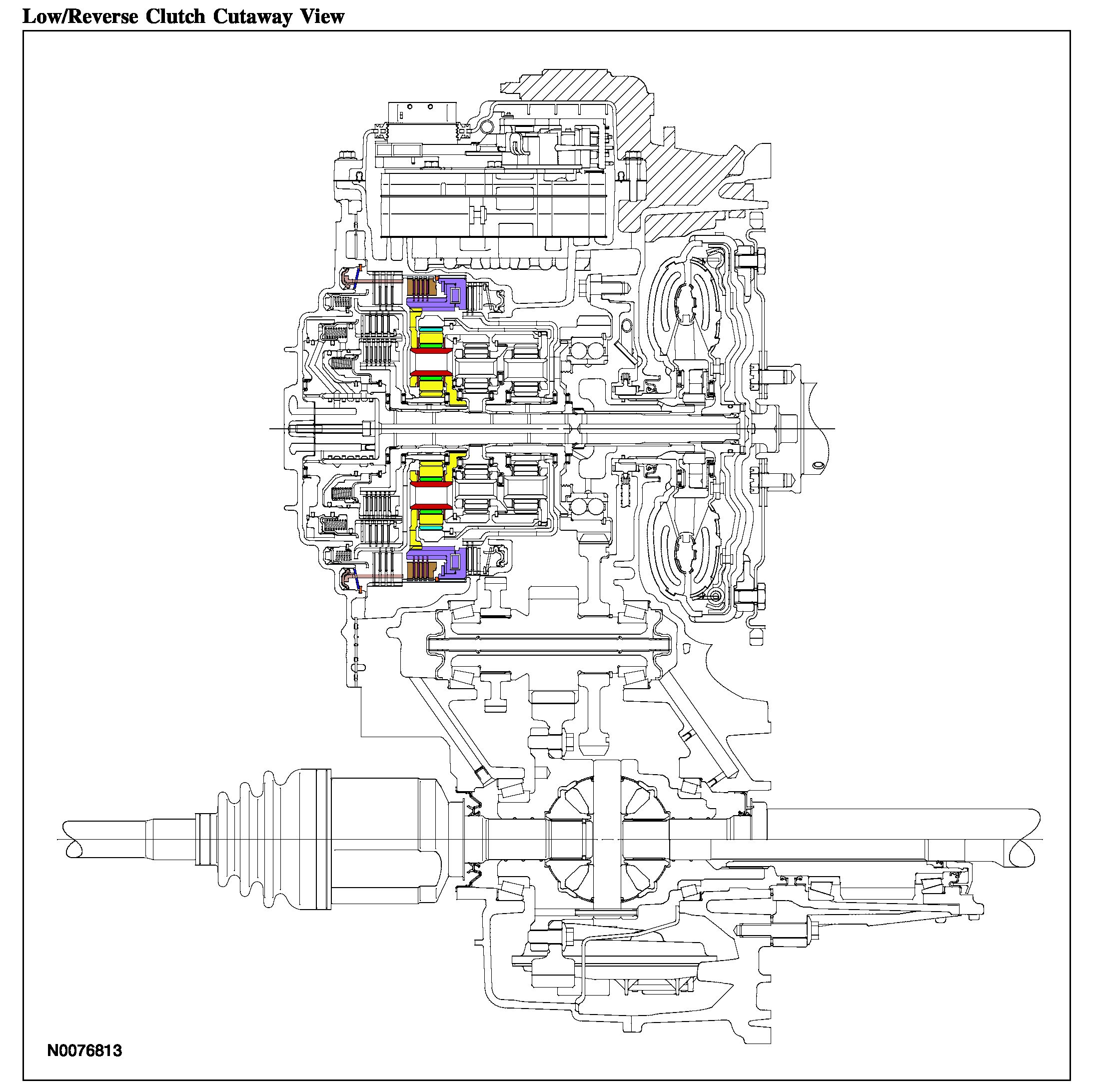 The low/reverse clutch is a brake clutch that holds the low OWC which is splined to the rear planetary carrier. The low/reverse clutch is applied in manual LOW, REVERSE and 1st gear up to 5 km/h (3 mph).