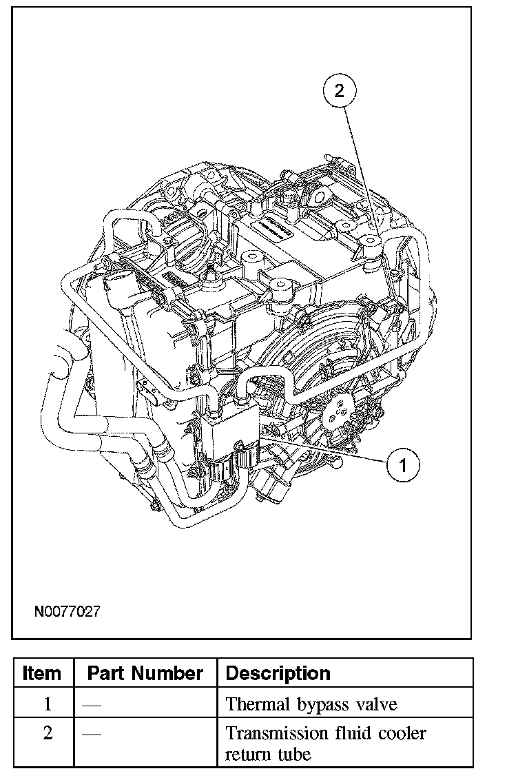 Transmission fluid enters the lubrication circuits after flowing through the transmission fluid cooler, mounted at the front of the vehicle. When the transmission fluid is not up to operating temperature a thermal bypass valve, mounted in line of the transmission fluid cooler tubes, allows the transmission fluid to bypass the transmission fluid cooler. Transmission fluid returns to the transaxle from the transmission fluid cooler tubes through the back transmission fluid cooler tube.