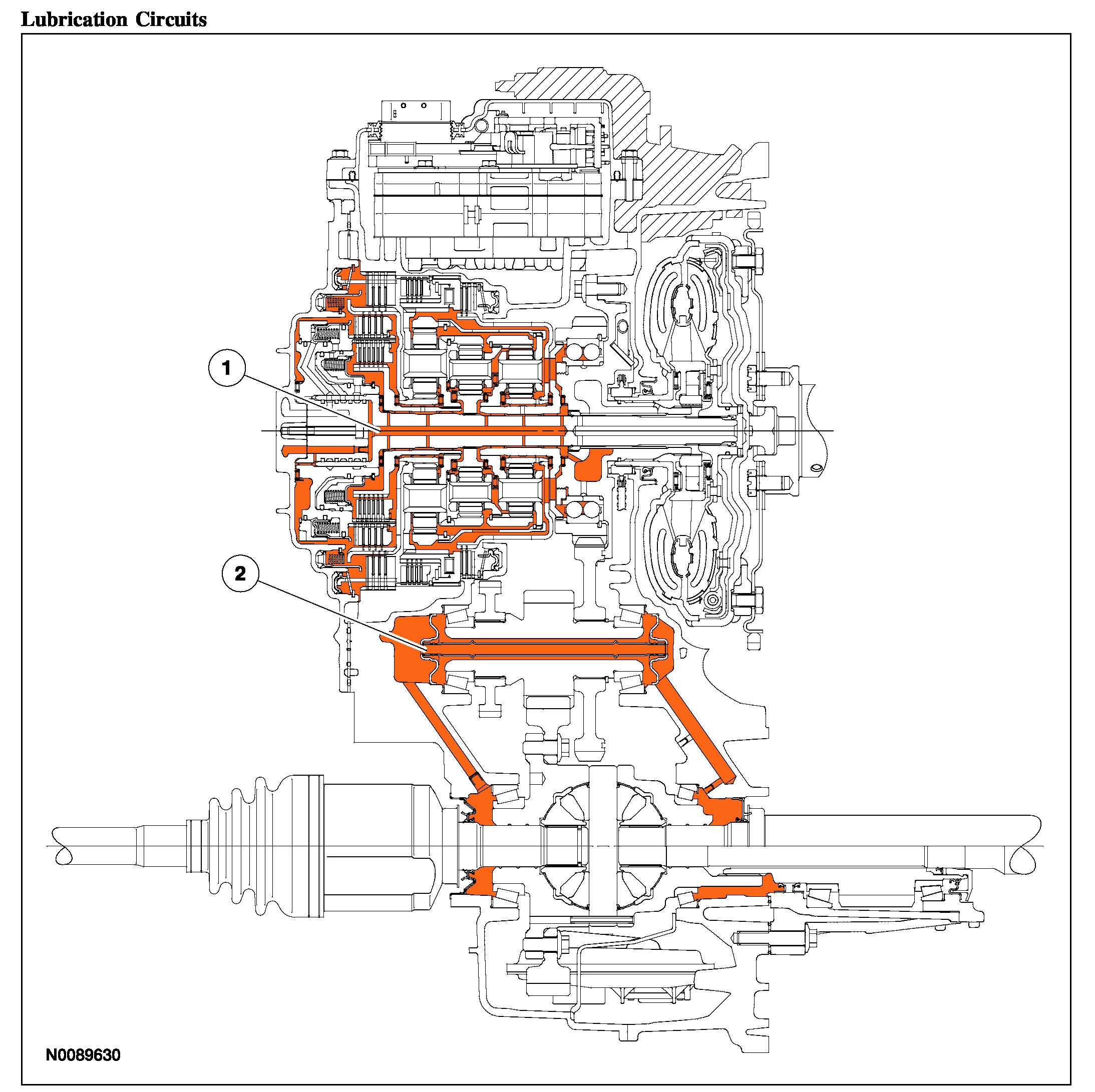 The transmission fluid enters 2 main lubrication circuits, the input shaft and final drive lubrication circuits, through the transaxle cover and flows through passages in the transaxle to lubricate the transaxle.