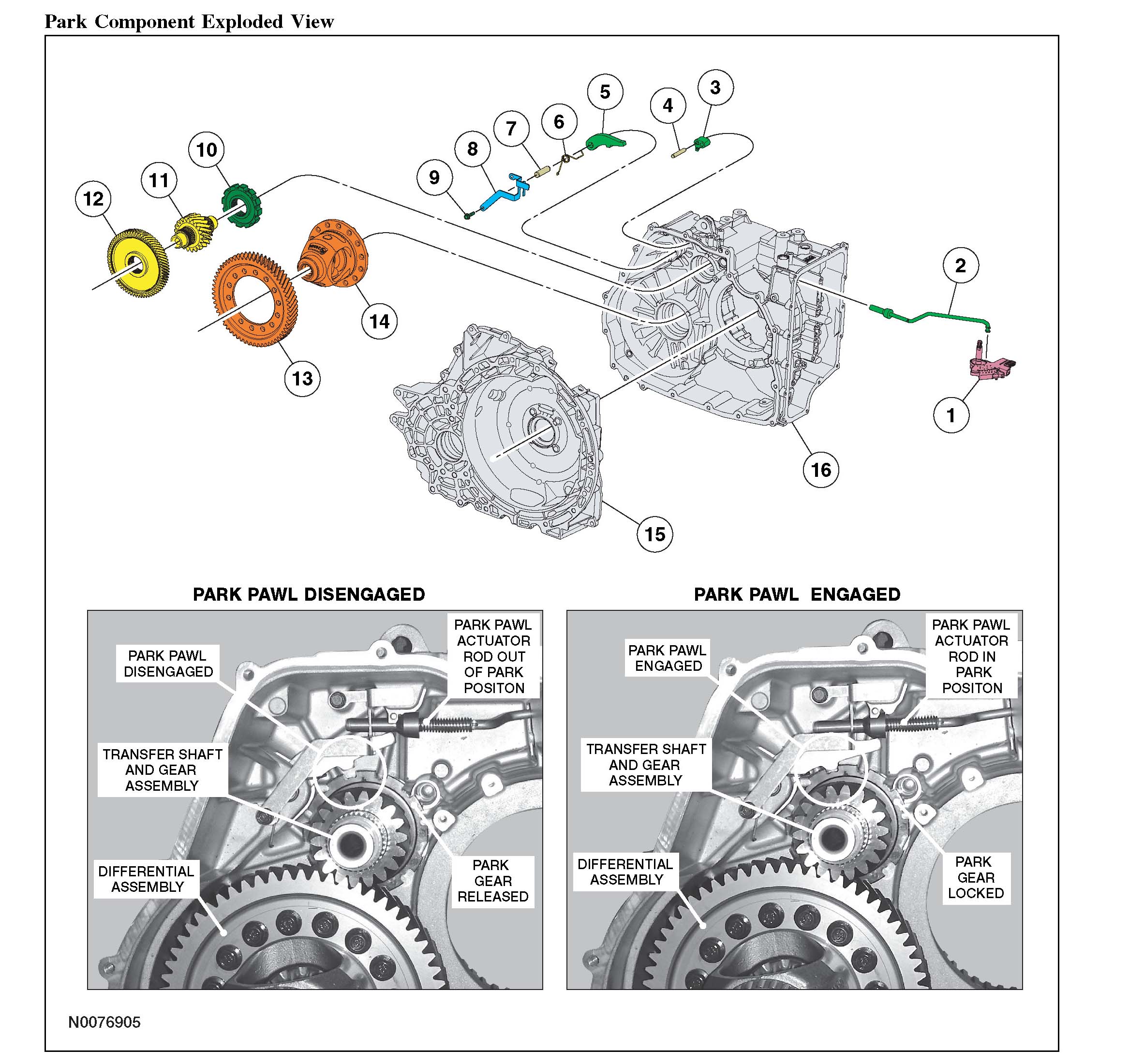 ^ The actuator rod pivots the park pawl into the lugs on the park gear, locking the gear stationary to the transaxle case.