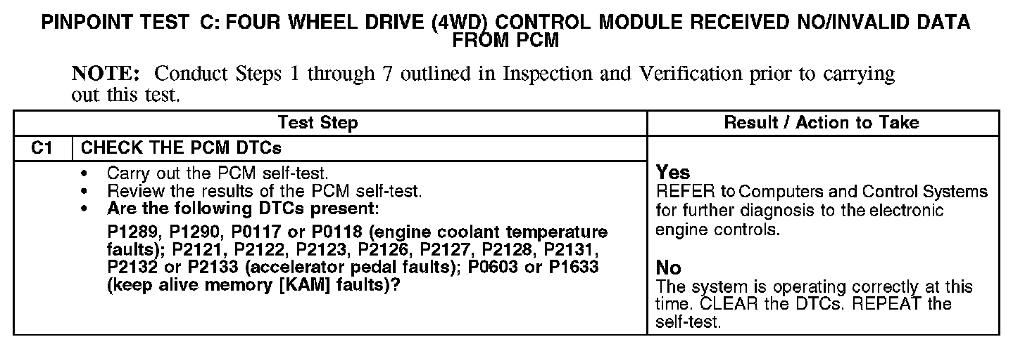 Pinpoint Test C: Four Wheel Drive (4WD) Control Module Received No/Invalid Data From PCMRefer to Vehicle/Diagrams, Four Wheel Drive (4WD) Systems for schematic and connector information.