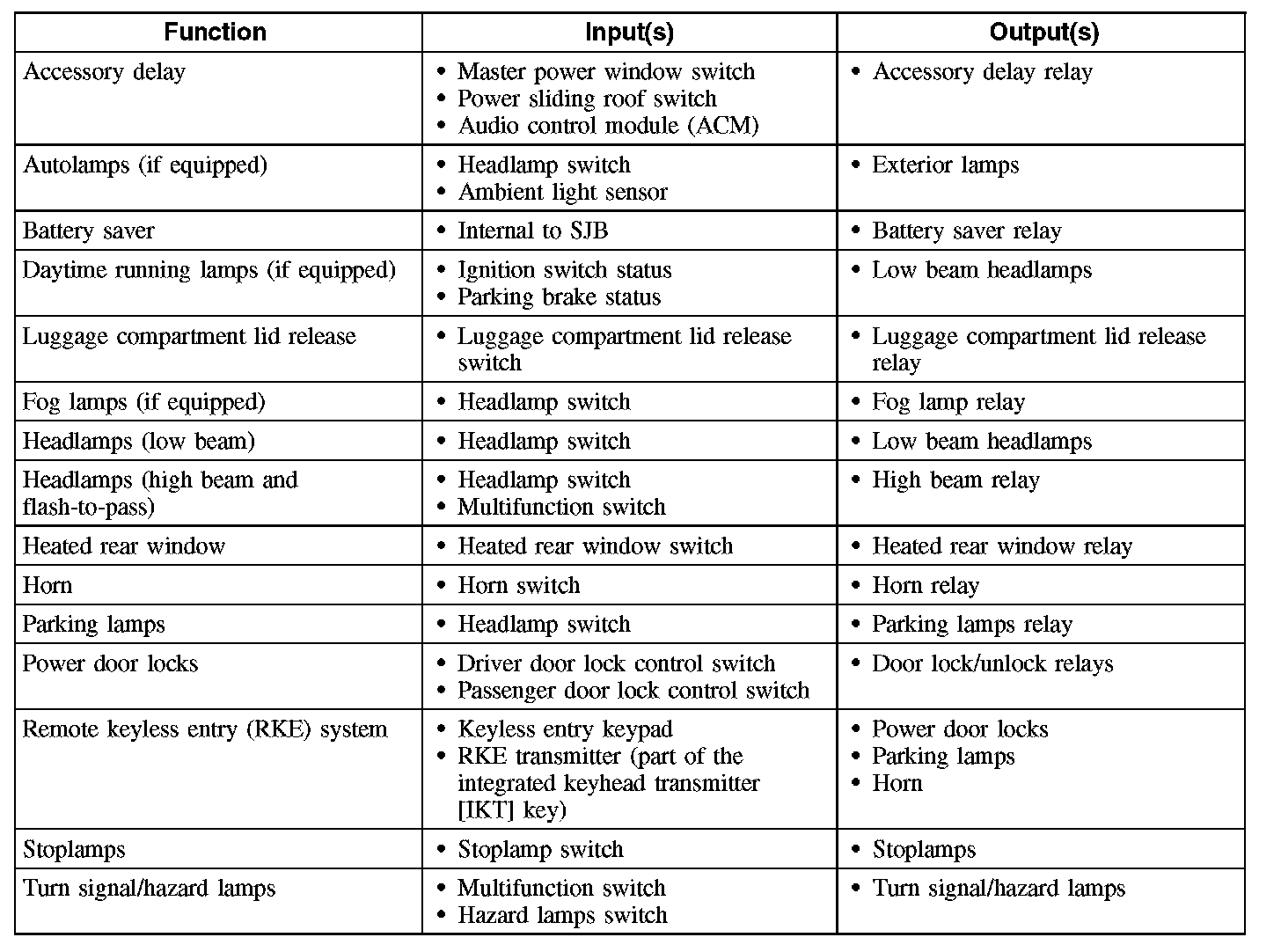 The SJB is a multifunction module that controls many of the vehicle systems. Most of the SJB functions utilize hardwired inputs and/or outputs. The SJB controls the following hardwired functions, using the corresponding inputs and outputs: