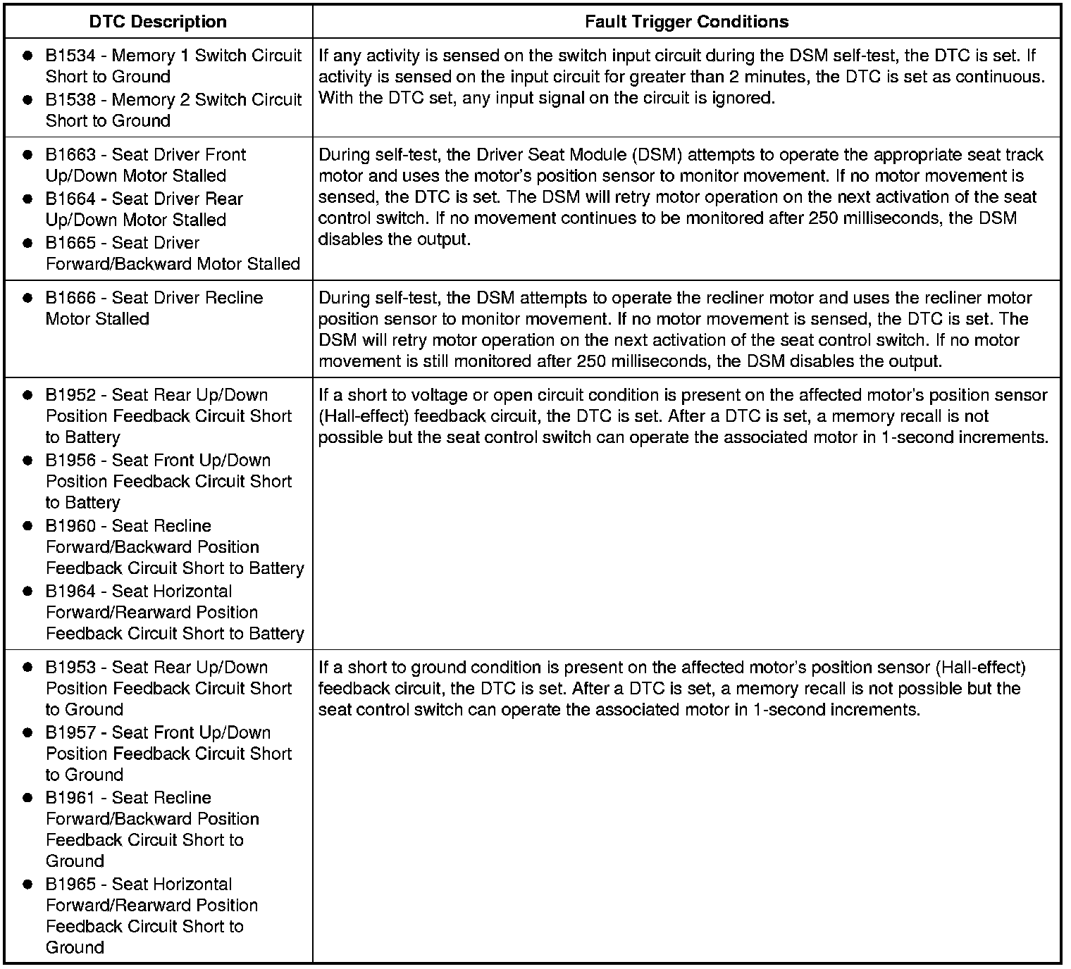 For any other DSM DTCs, REFER to the Driver Seat Module (DSM) DTC Chart or Master DTC Chart in Body Control Systems. Diagnostic Trouble Code (DTC) Chart