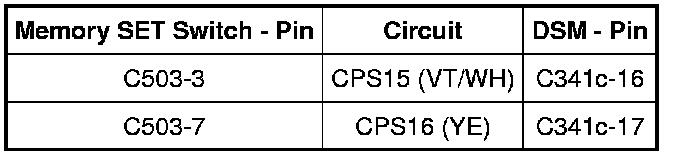- Measure the resistance between memory SET switch C503 and C341c, using the following chart.