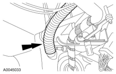 3. From under the hood, loosen the bolt and disconnect the LH bulkhead electrical connector.