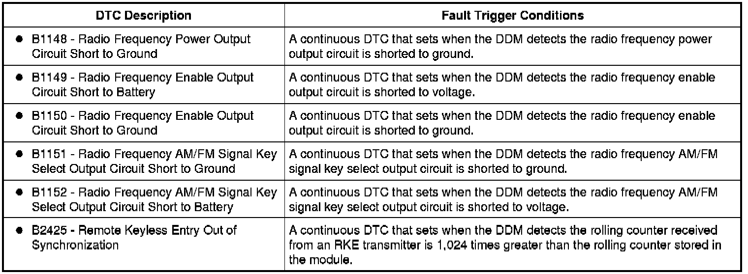 The RKE transmitters and DDM also utilize a rolling code to prevent the code from being "captured" by a code grabber. The system advances the counter in the RKE transmitter and DDM every time an RKE transmitter button is pressed.