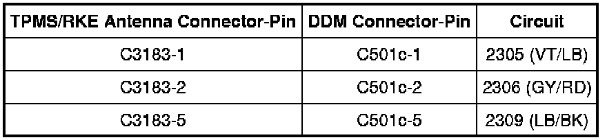 - Measure the resistance between the TPMS/RKE antenna C3183-3, circuit 2307 (BK/WH), harness side and the DDM C501c-3, circuit 2307 (BK/WH), harness side.