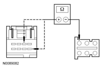 - Inoperative LH mirror: Measure the resistance between exterior mirror control switch C527-5, circuit 940 (DB/OG), harness side and LH exterior mirror C516-1, circuit 940 (DB/OG), harness side.
