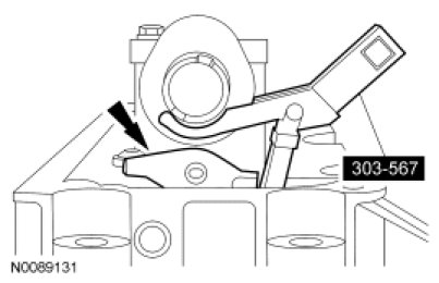 57. NOTICE: Unless otherwise instructed, at no time when the timing chains are removed and the cylinder heads are installed is the crankshaft or camshaft to be rotated. Severe piston and valve damage will occur.