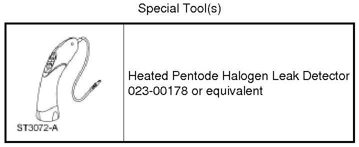 Leak test the refrigerant system using the Heated Pentode Halogen Leak Detector. Follow the instructions included with the Heated Pentode Halogen Leak Detector for handling and operation techniques.