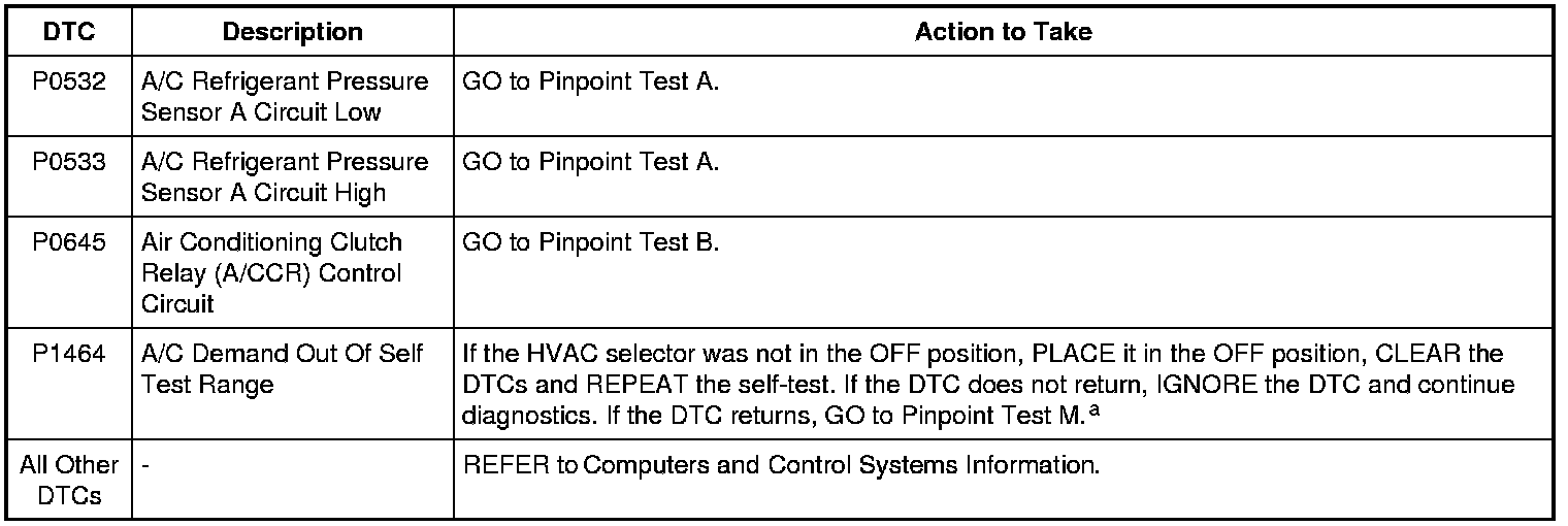 PCM DTC P1464 will set if the function selector is in PANEL with A/C button pressed, DEFROST or MAX A/C mode when the on-demand self test is being run.