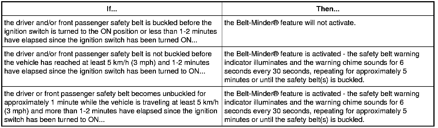 The Belt-Minder(R) feature is a supplemental warning to the safety belt warning function. This feature provides an additional reminder to the driver that the driver and/or front passenger safety belt is unbuckled by intermittently sounding a chime and illuminating the safety belt warning indicator in the Instrument Cluster (IC) module.