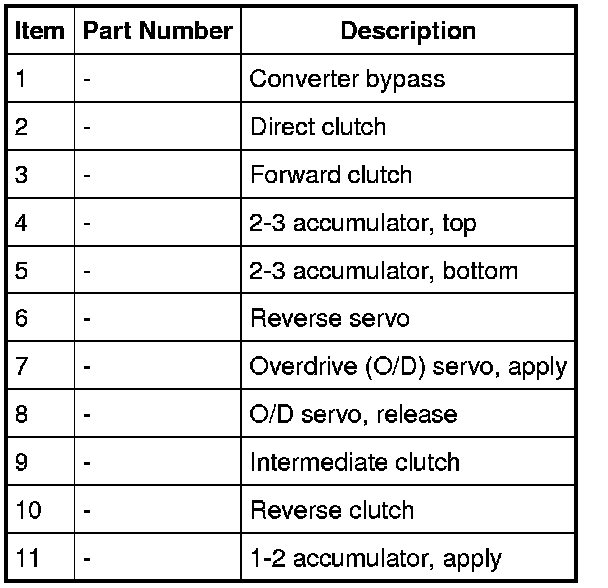 Apply air to the appropriate clutch port (refer to the Transmission Air Test Plate illustration). A dull thud may be heard or movement felt when the component is applied or released. If clutch seals or check balls are leaking a hissing sound may be heard.