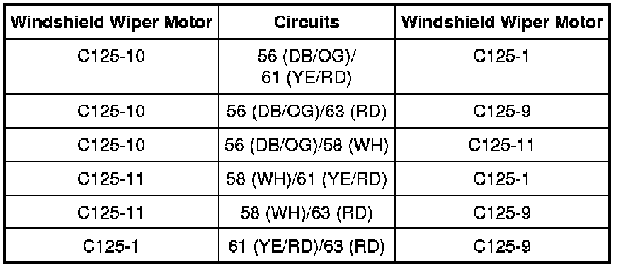 - Measure the resistance at windshield wiper motor C125, harness side, between the circuits shown in the following chart.