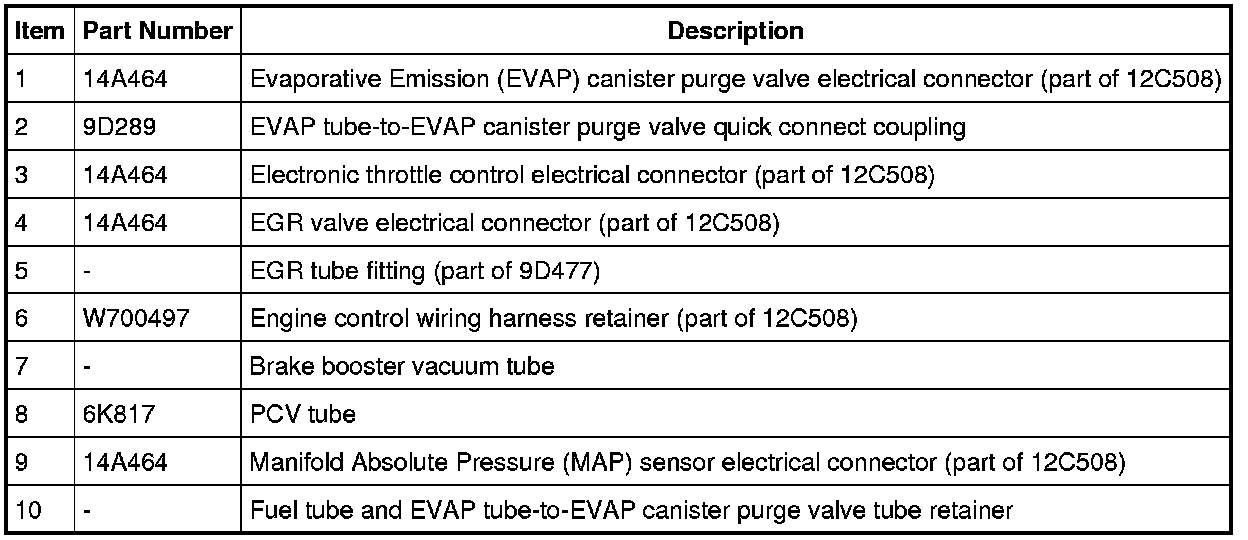 7. Disconnect the EVAP tube-to-EVAP canister purge valve quick connect coupling and the brake booster vacuum tube from the upper intake manifold.